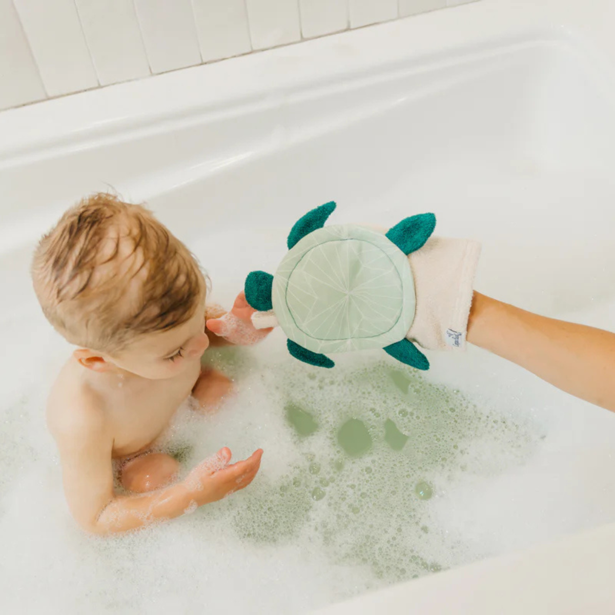 Made of super-soft bamboo terry cloth. Featuring loops to hang dry, the mitts have a universal fit for any-size hand.