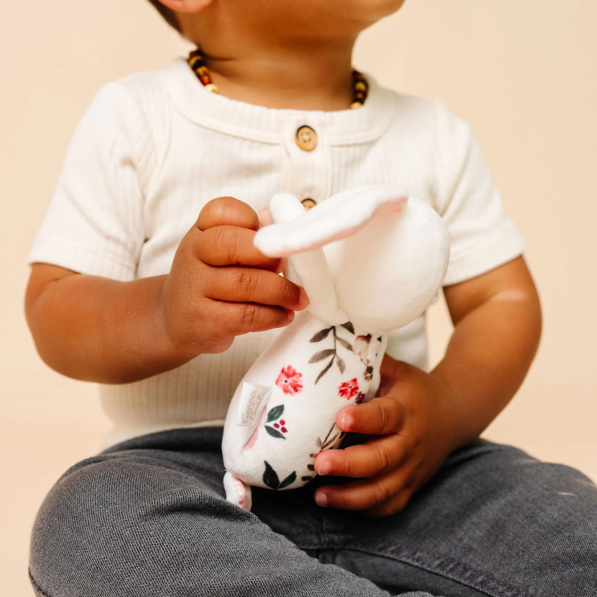 Designed for little hands, this pint-sized pal is easy for baby to grab. Made with super soft fabric, this adorable stuffed rattle offers sensory engagement with a gentle bell sound and ultra-luxe materials.