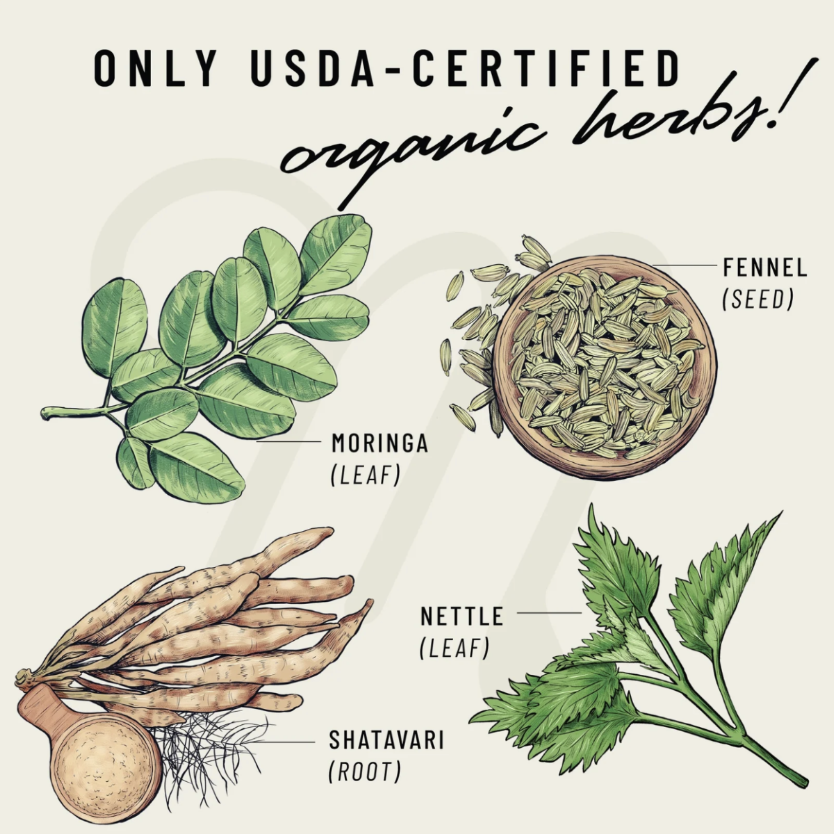 This Milkapalooza lactation supplement contains 4 powerful organic herbs to boost breast milk supply.