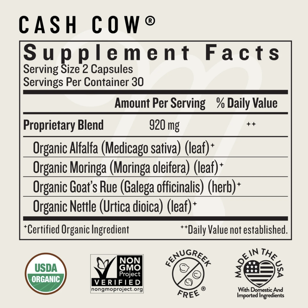 Alfalfa and moringa are rich sources of essential vitamins and nutrients to help nourish both mom and baby. Try our lactation capsules instead of indulging in high-sugar lactation cookies, bars, and treats. Cash Cow can also be used in the final weeks of pregnancy to strengthen the body in preparation for birth.