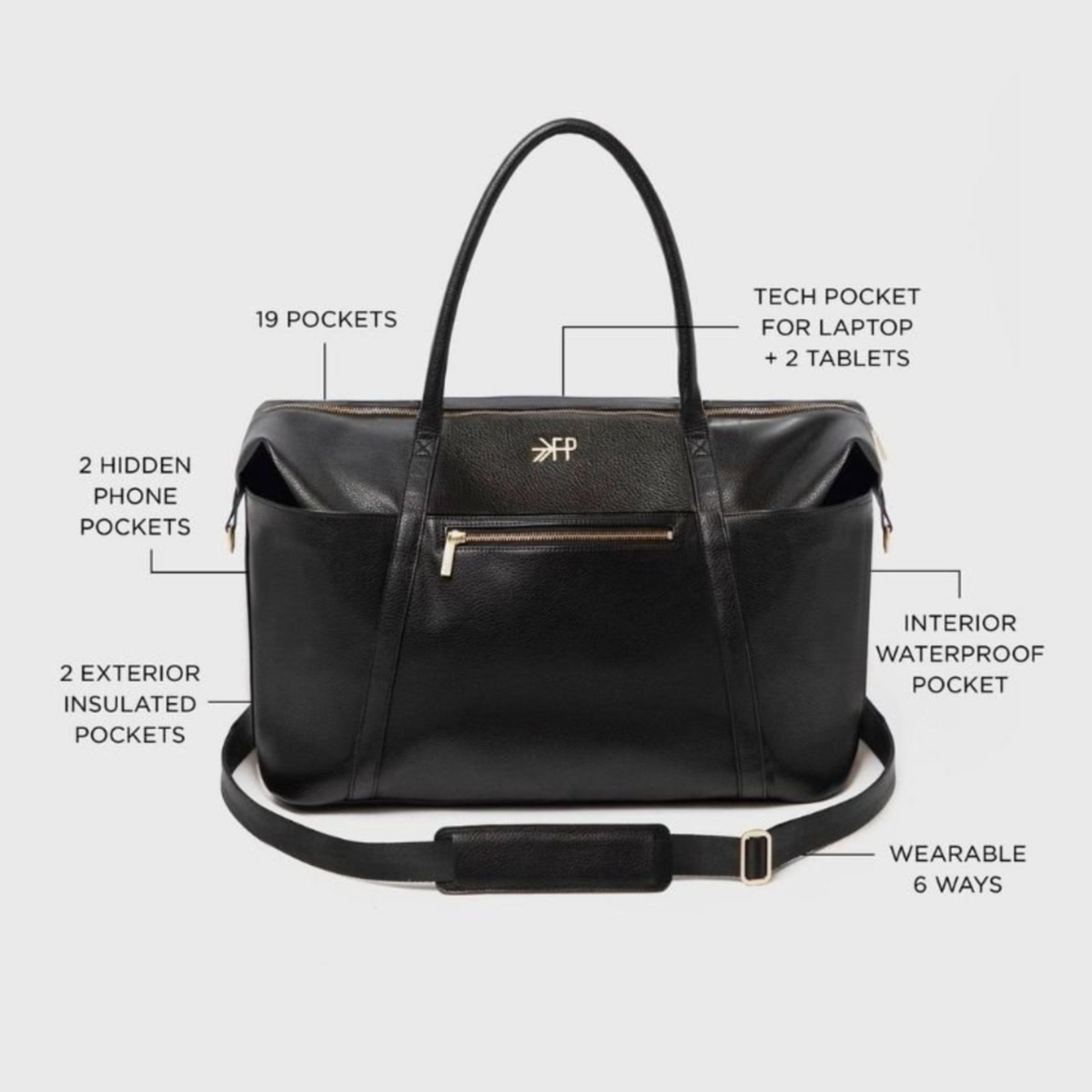 The Weekender by Freshly Picked has everything you need during travel accessible on the exterior and everything for your destination neatly organized on the inside. Made with high quality durable vegan leather this bag is easily wipeable and has so many pockets for storage you won't fill them all! Specifically made for moms this is the bag you don't want to travel without!