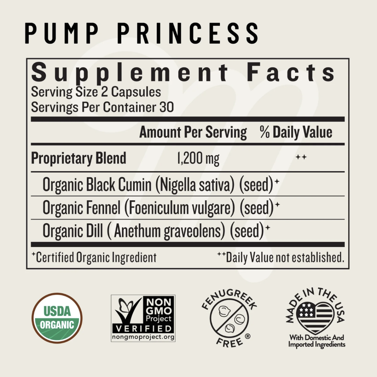 Pump Princess: Organic nigella sativa (seed) AKA Black Seed, organic fennel (seed), organic dill (seed), organic vegetable capsule.