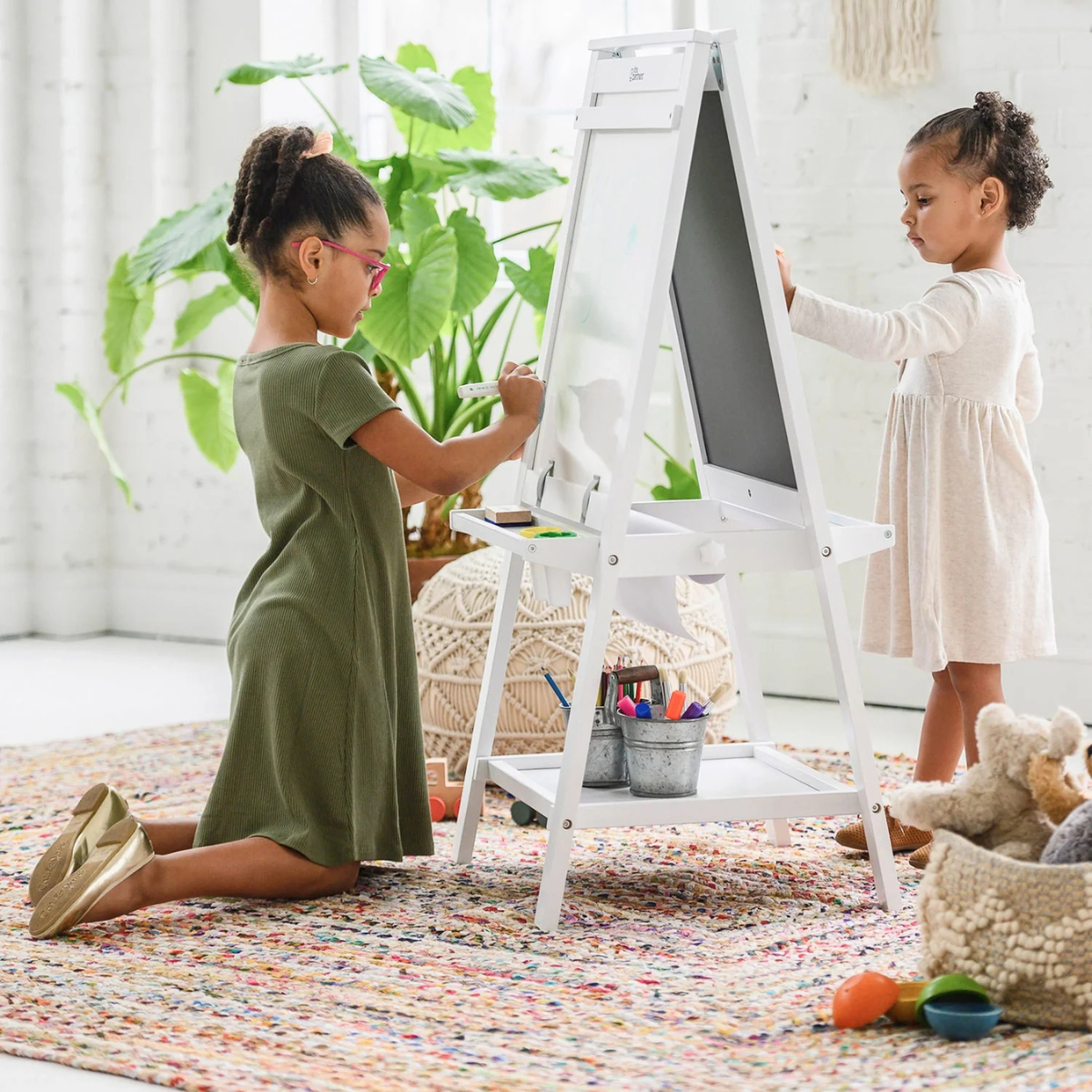 Let your little artist explore their creativity with a wooden folding easel from Little Partners! The space-saving design folds out into a versatile, double-sided easel with both chalkboard and whiteboard surfaces.