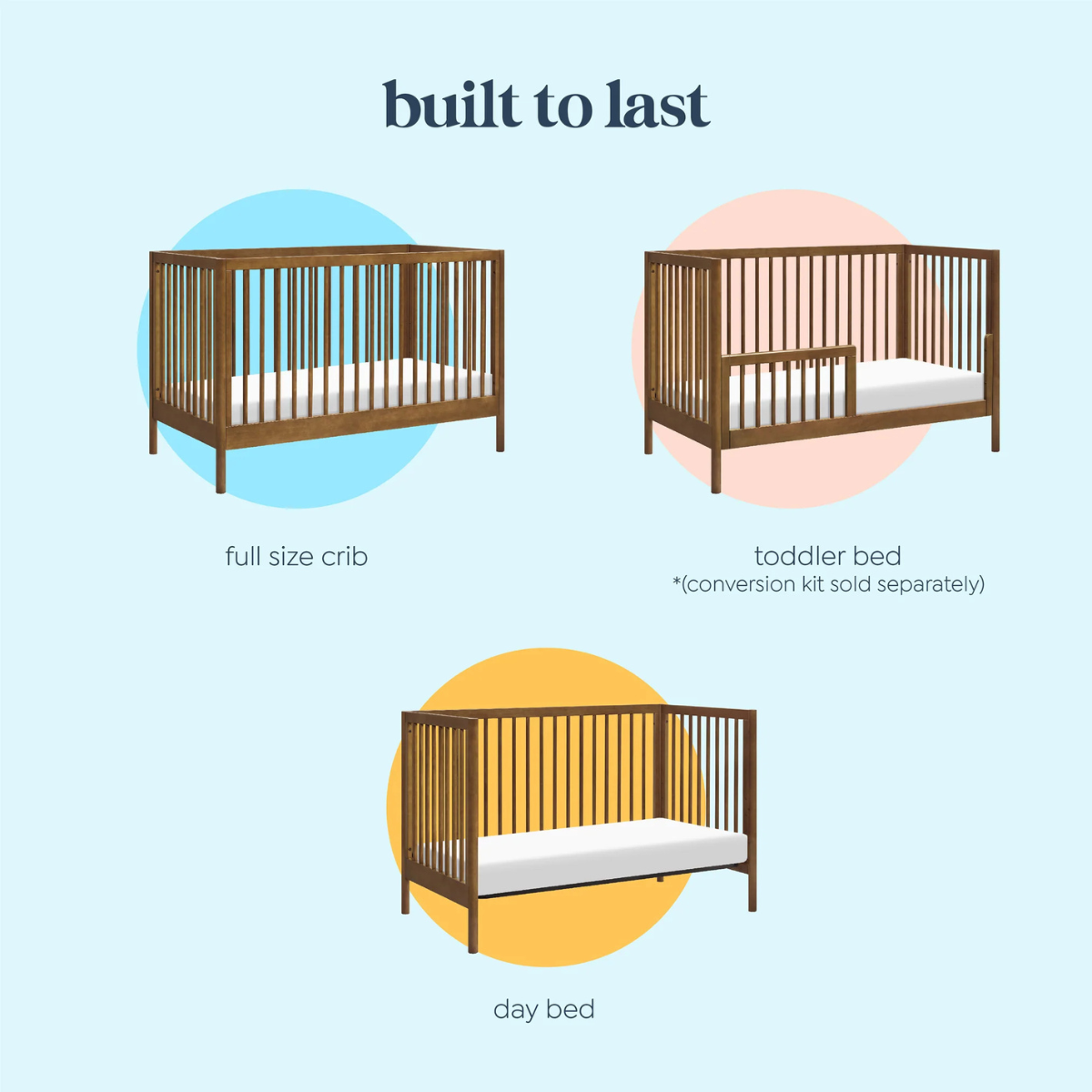 The simple & versatile design of the Birdie 3-in-1 Convertible Crib adds style to modern & classic nurseries. Built to seamlessly transition from newborn to toddler, the crib has 4 different mattress heights and easily converts to a toddler bed & daybed.