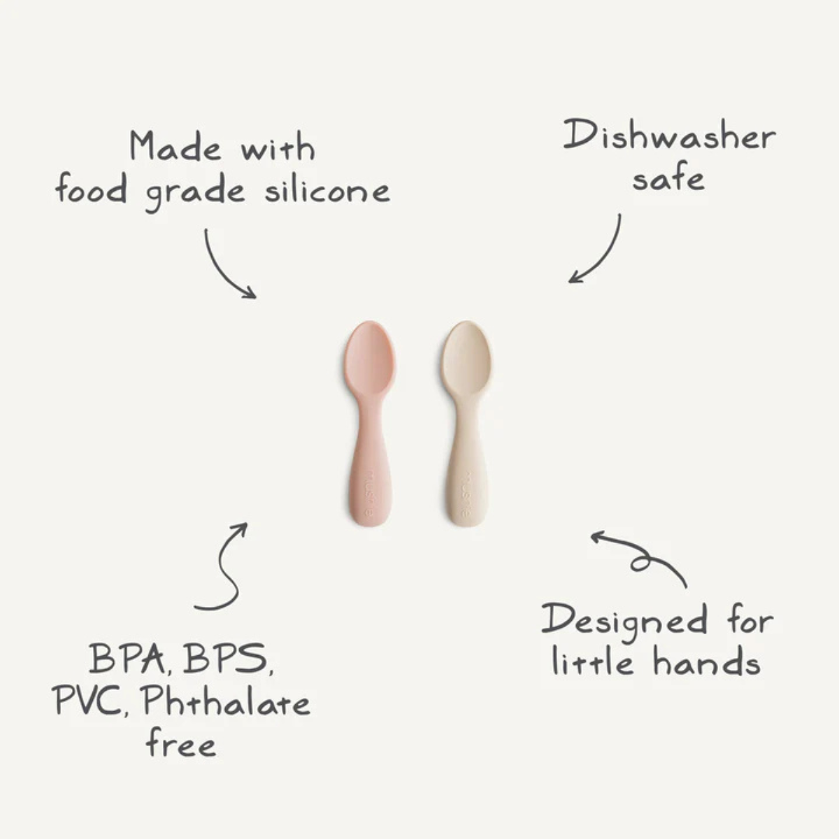 Mushie toddler starter spoons are the perfect companion for your little one's journey into independent feeding. Made from non-toxic, food-grade silicone, these spoons are gentle on sore, sensitive gums and emerging teeth.