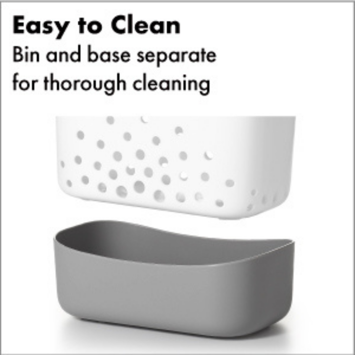 Our slim Bath Toy Bin features a large, comfortable handle for scooping toys out of the tub or toting them around. Place the Bin on the sturdy plate to store, or use its flat bottom to stand it up next to the bathtub. Large holes let air through and water drain so toys and accessories dry quickly.