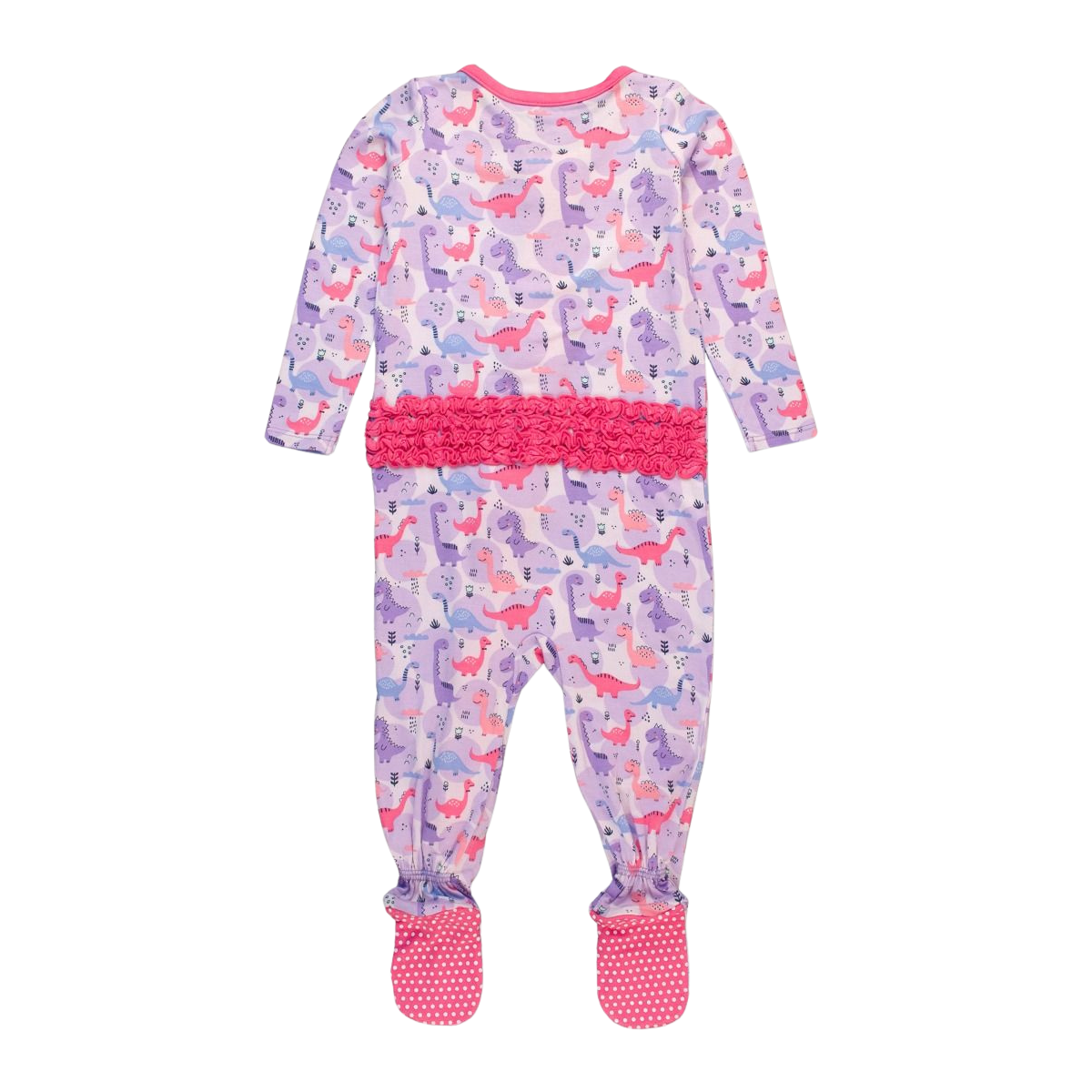 The unique 2-way zipper design simplifies dressing and diaper changes, while the slip-resistant soles make them ideal for both sleep and play. Featuring charming ruffle details and signature rear ruffles, these pajamas are a standout in the Sweetie-saurus collection. They are designed to resist fading, snagging, and pilling, ensuring they look great even after repeated washes. The breathable material makes these pajamas perfect for year-round comfort, making them a versatile addition to your child's wardrobe.