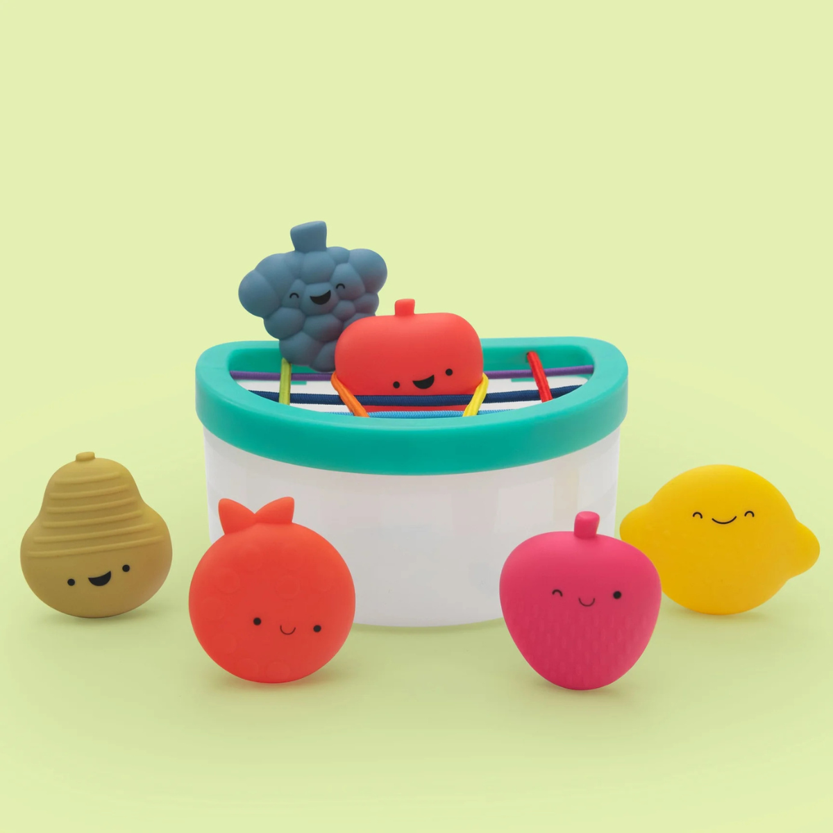 The Sassy Fruit Fill n' Spill has textural fruits, learn each fruit’s shape and color, and fill up the container to spill out the contents.