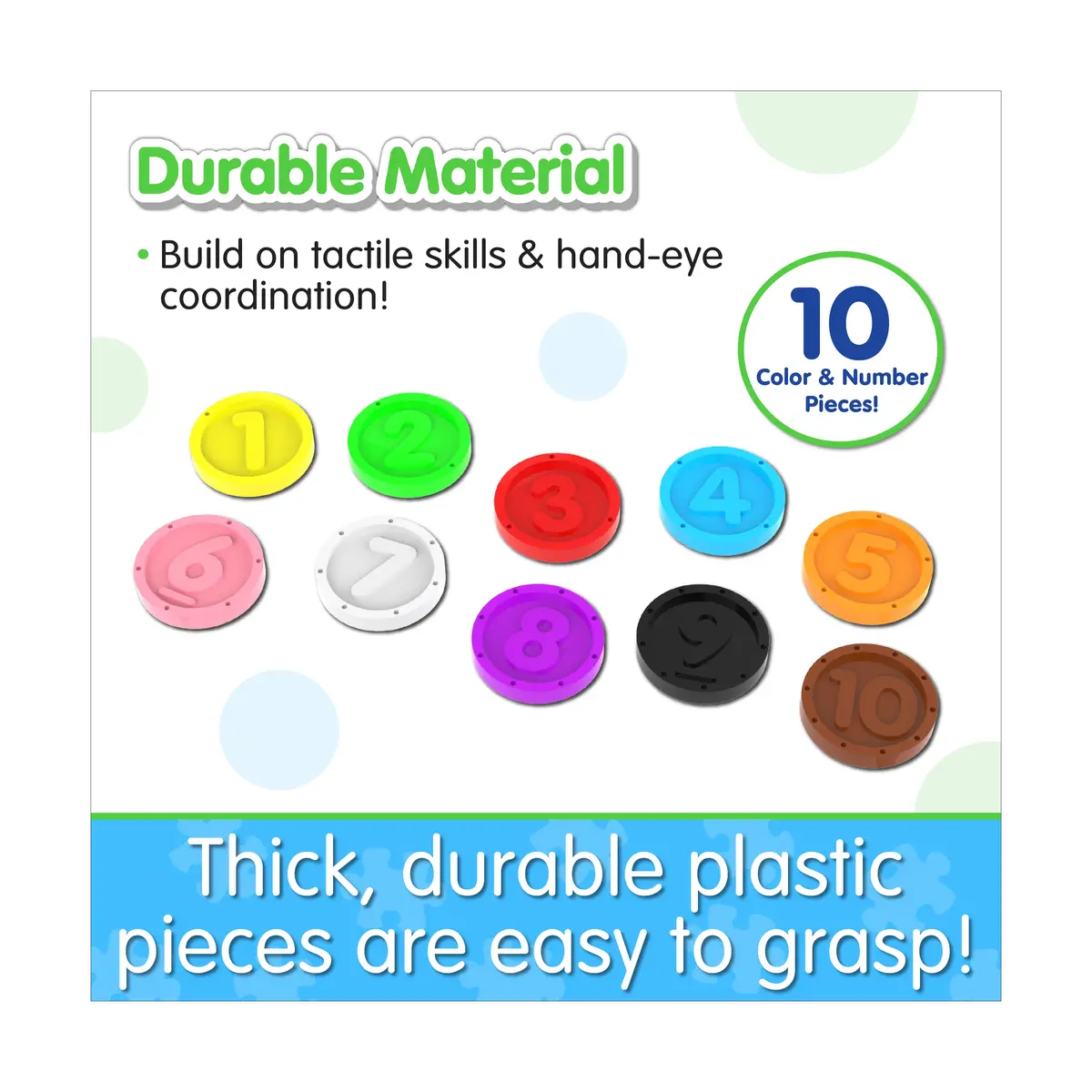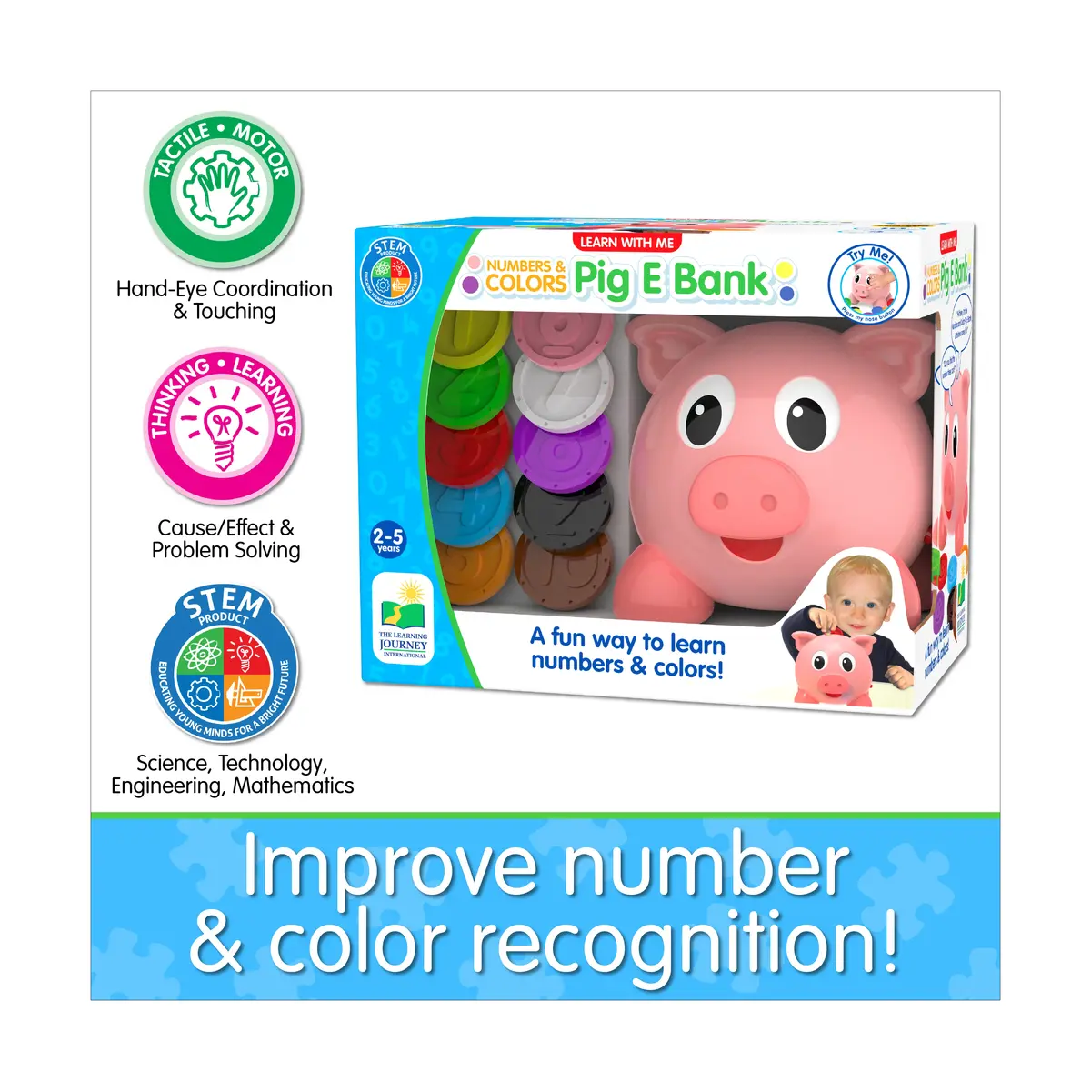 Numbers & Colors Pig E Bank is an adorable interactive learning toy that includes a talking pig shaped sorter, 10 chunky coins, and has 2 play modes: Learning and Find It! Each coin has its own color and shows a bold number 1-10.